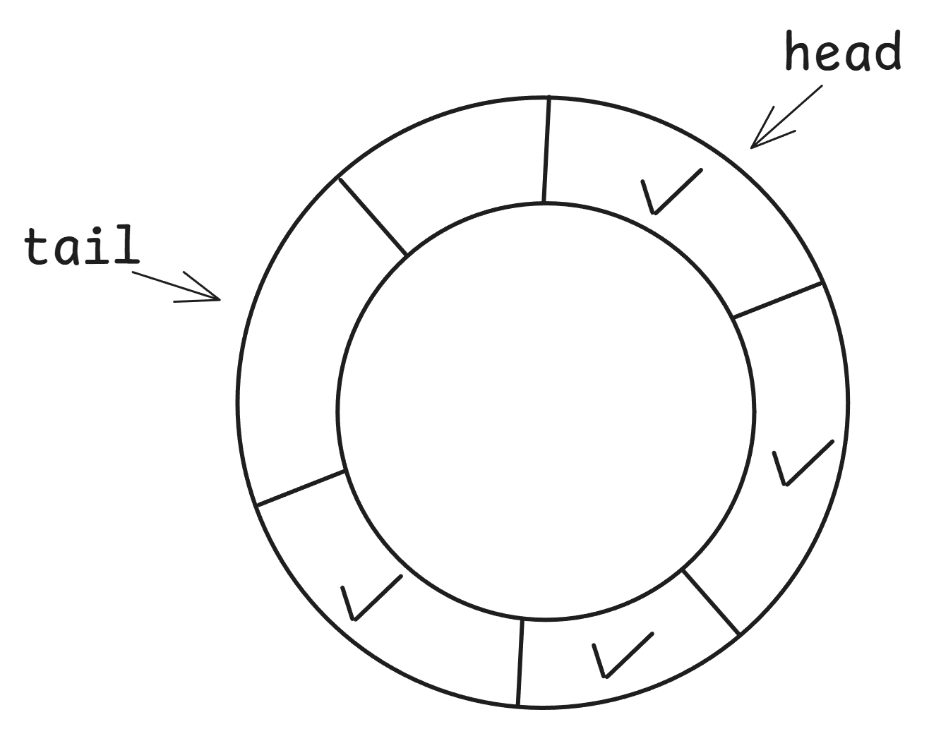 首先设置几个成员变量,这里的 head 始终指向第一个有效数据,tail 始终指向空位置: