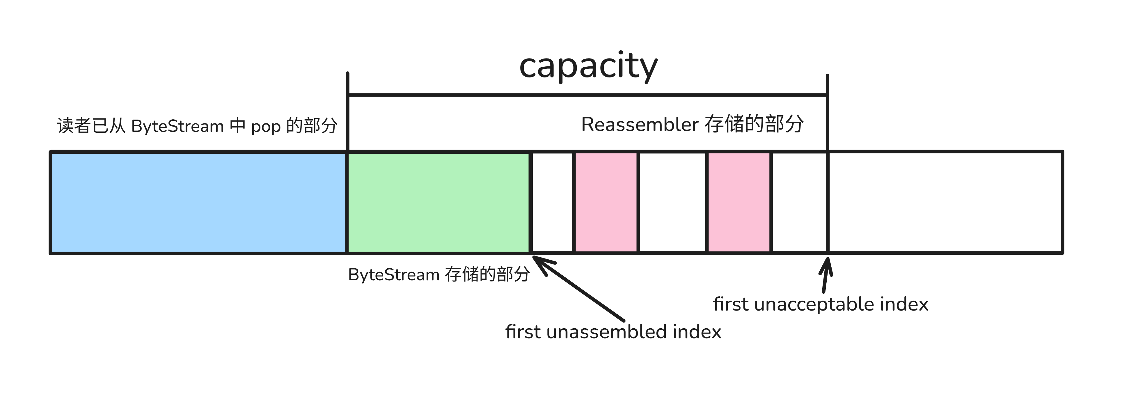 接下来我们要实现一个重组器。重组器接受一个乱序的数据流,把他们组织成顺序并 push 到 ByteStream 中,这样读者就能读取顺序数据了,如下图所示: