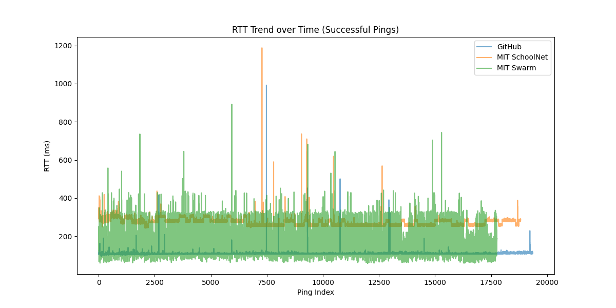 这个 Lab 让我们 ping 一小时远程主机来收集数据画图。我在校园网环境下 ping 了 github、mit.edu,还在手机热点下 ping 了 mit.edu。
