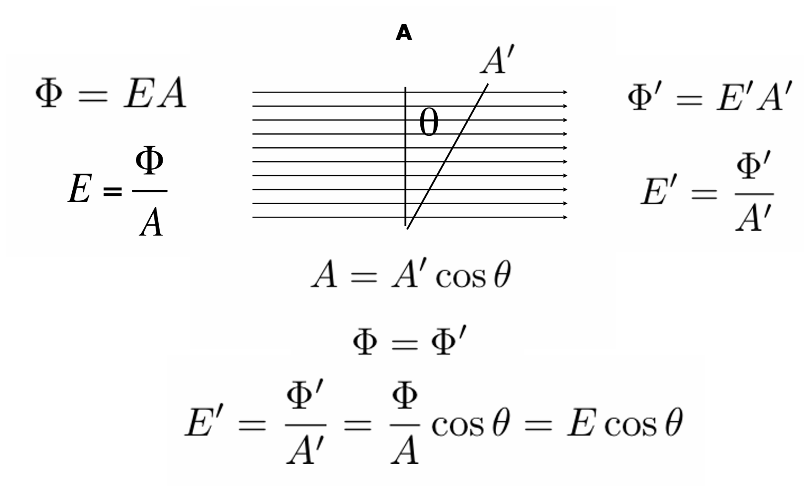 下图计算并对比了平行光穿过两个不同截面时的 irradiance:垂直截面 $A$,以及与垂直方向成 $\theta$ 角的倾斜截面 $A’$。