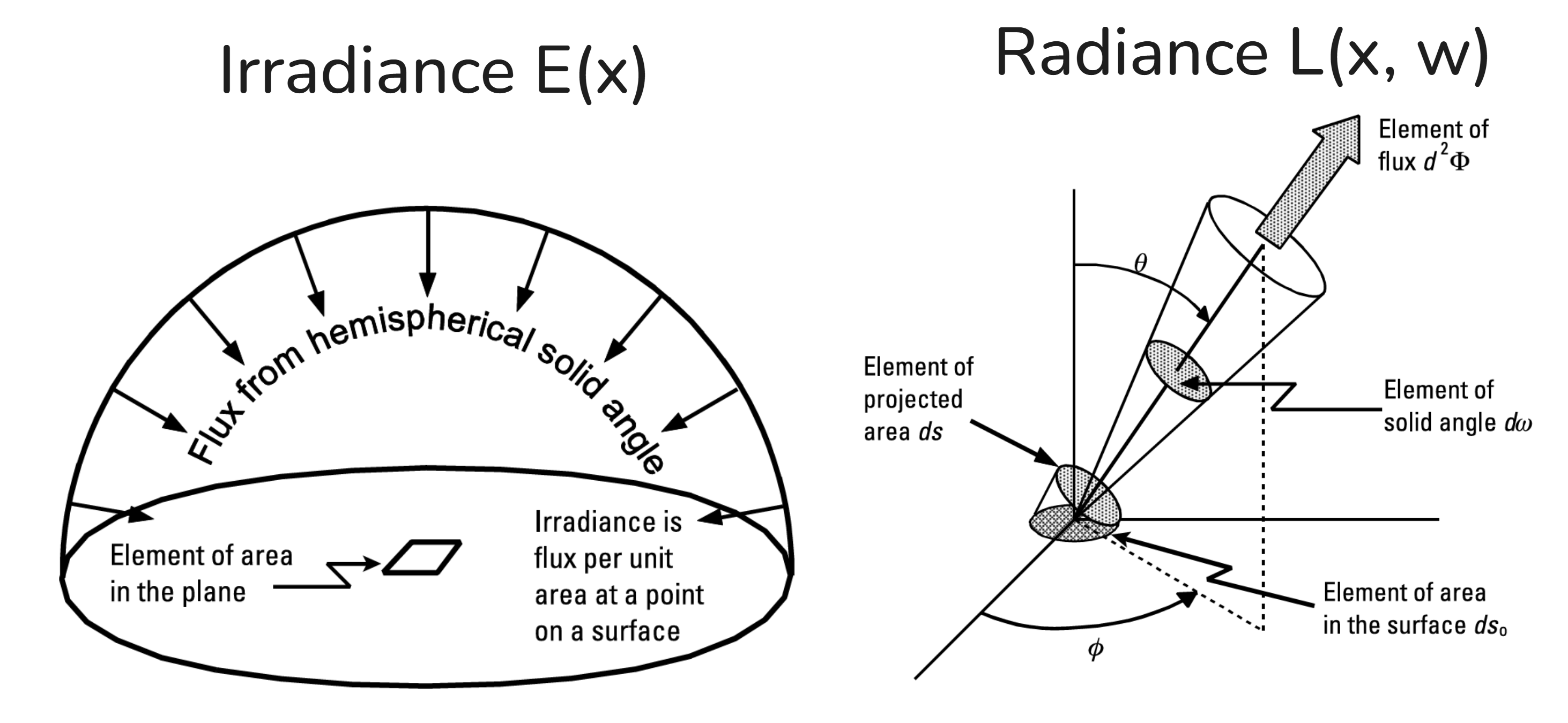- Radiance $L$,单位 $\frac{W}{\text{sr}\cdot m^2}$.