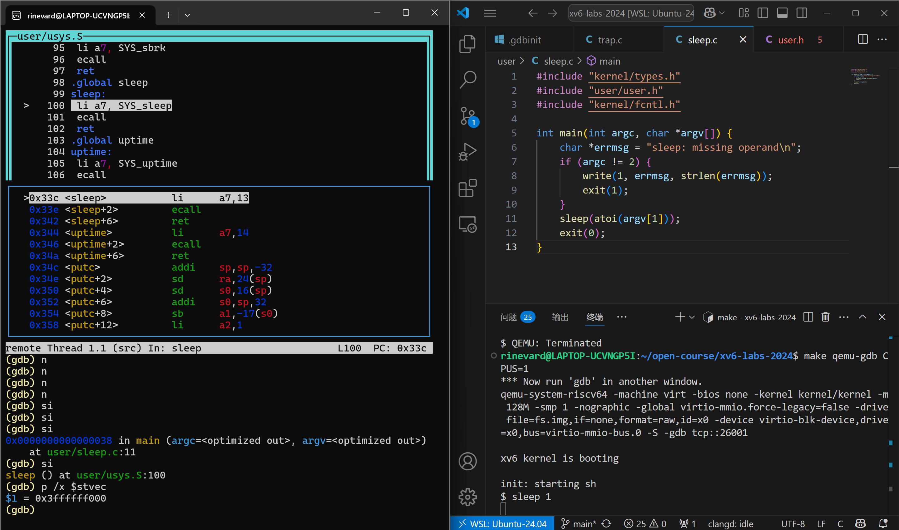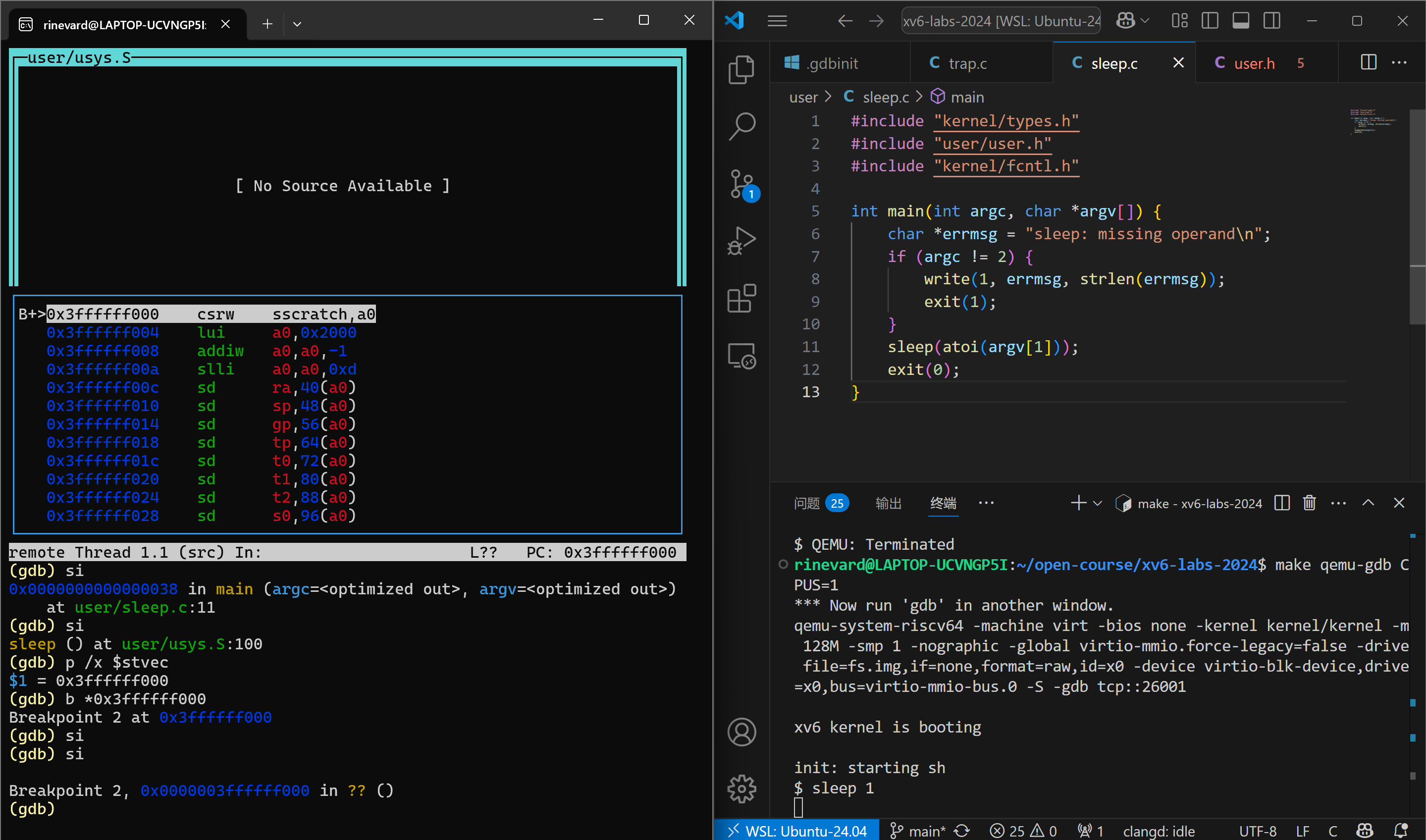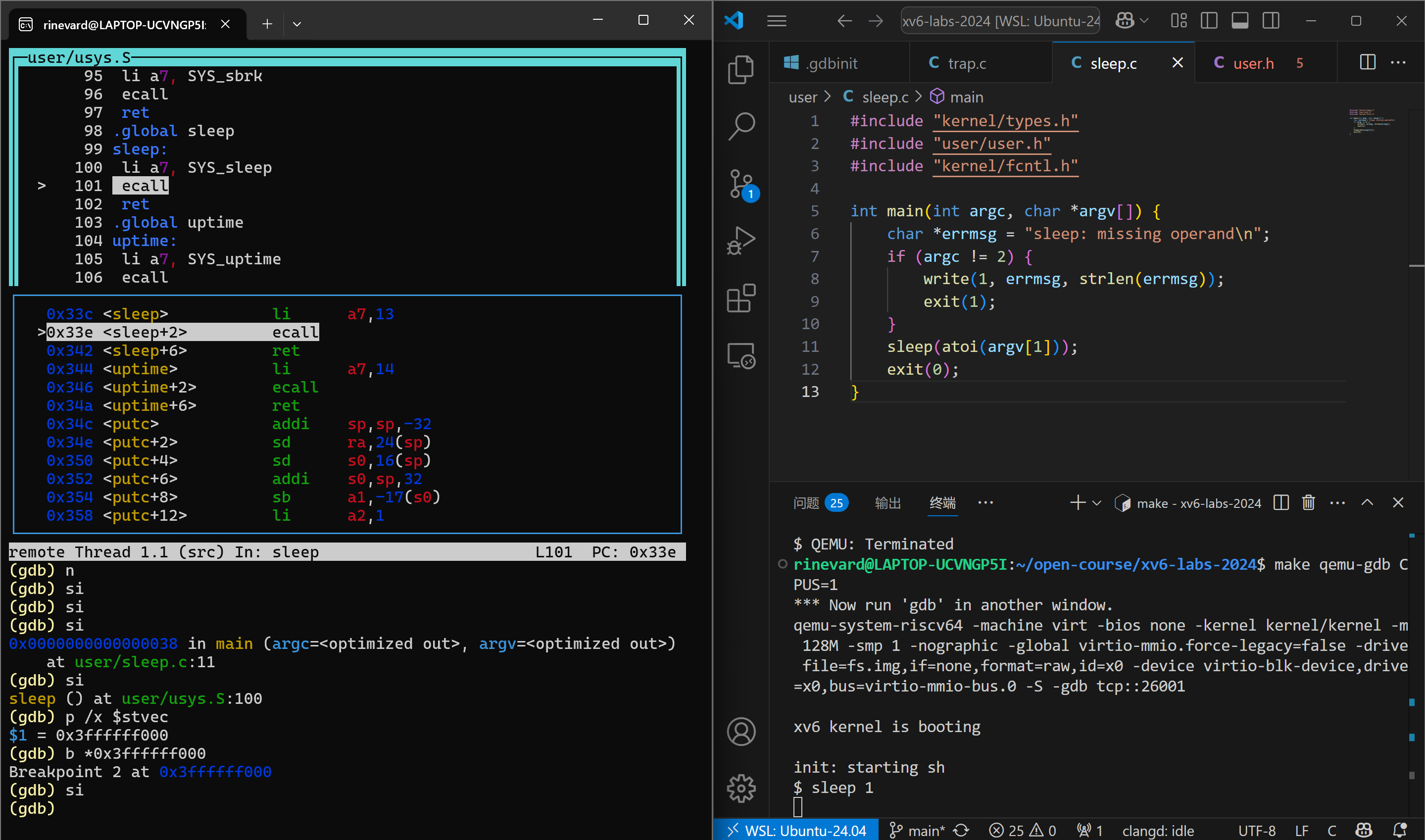 然后在xv6的shell里执行 sleep 1 ,它会在断点处停下。