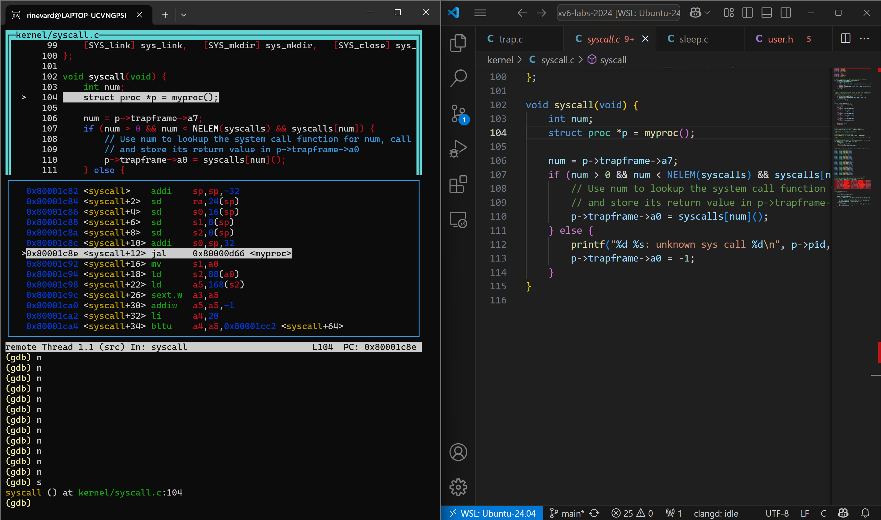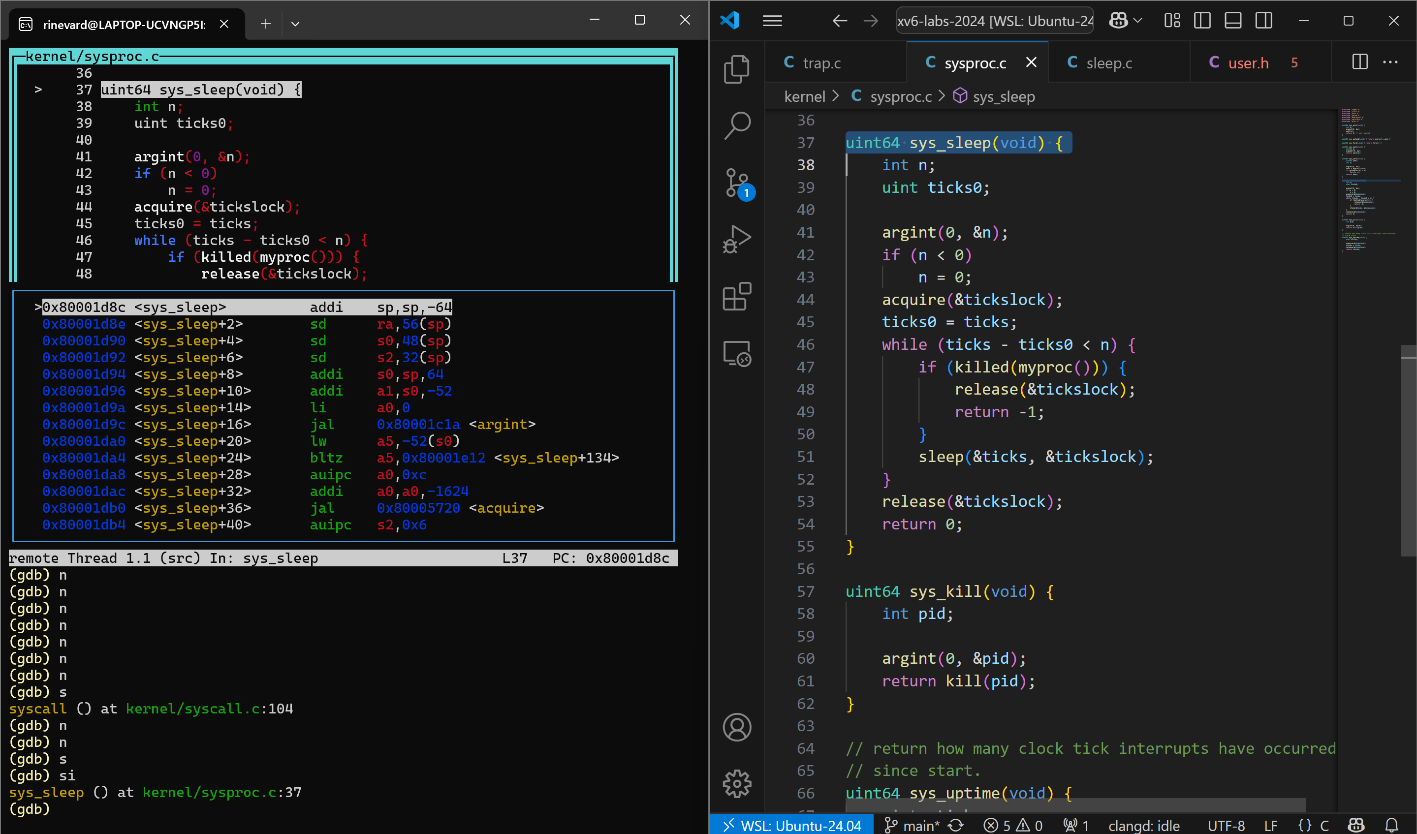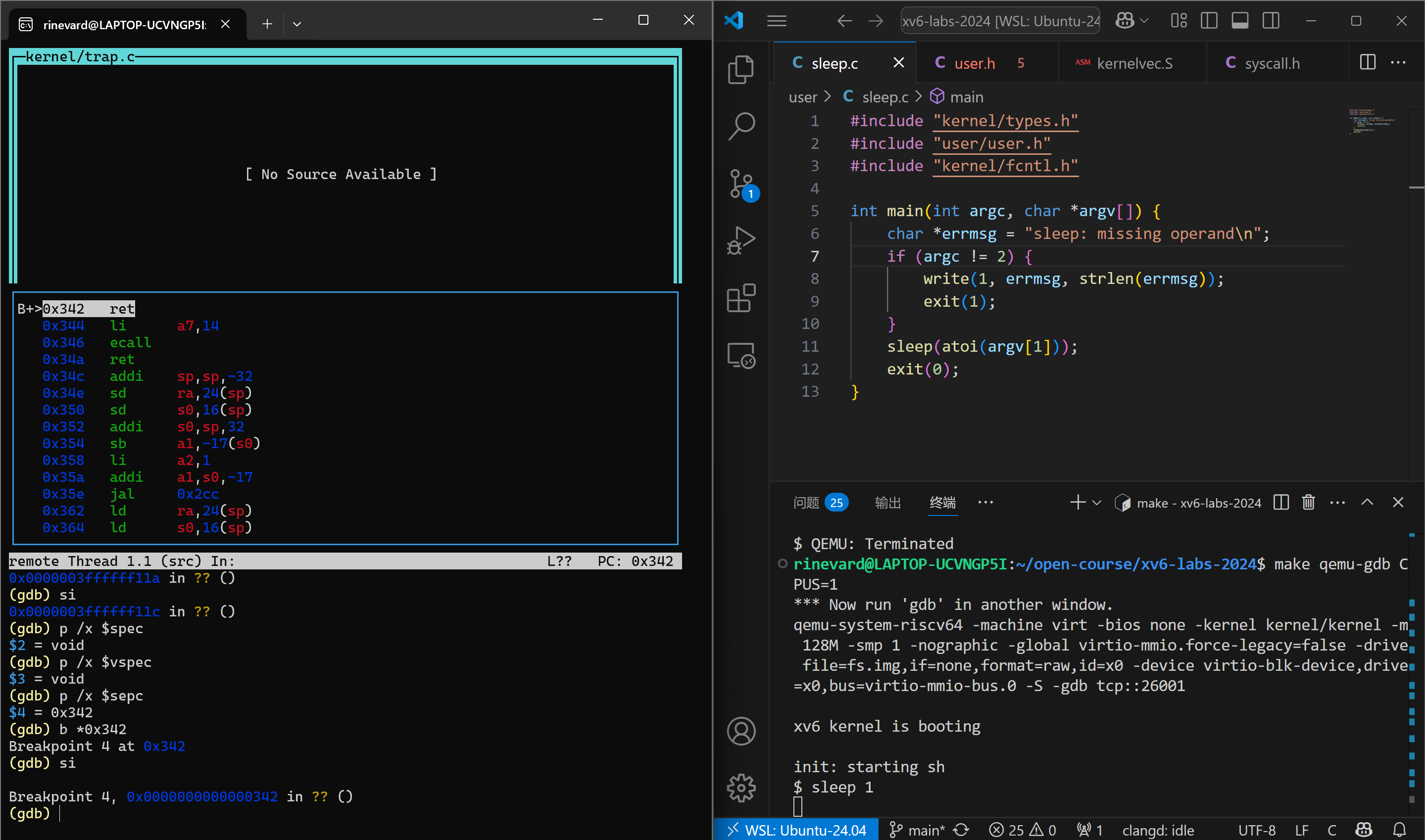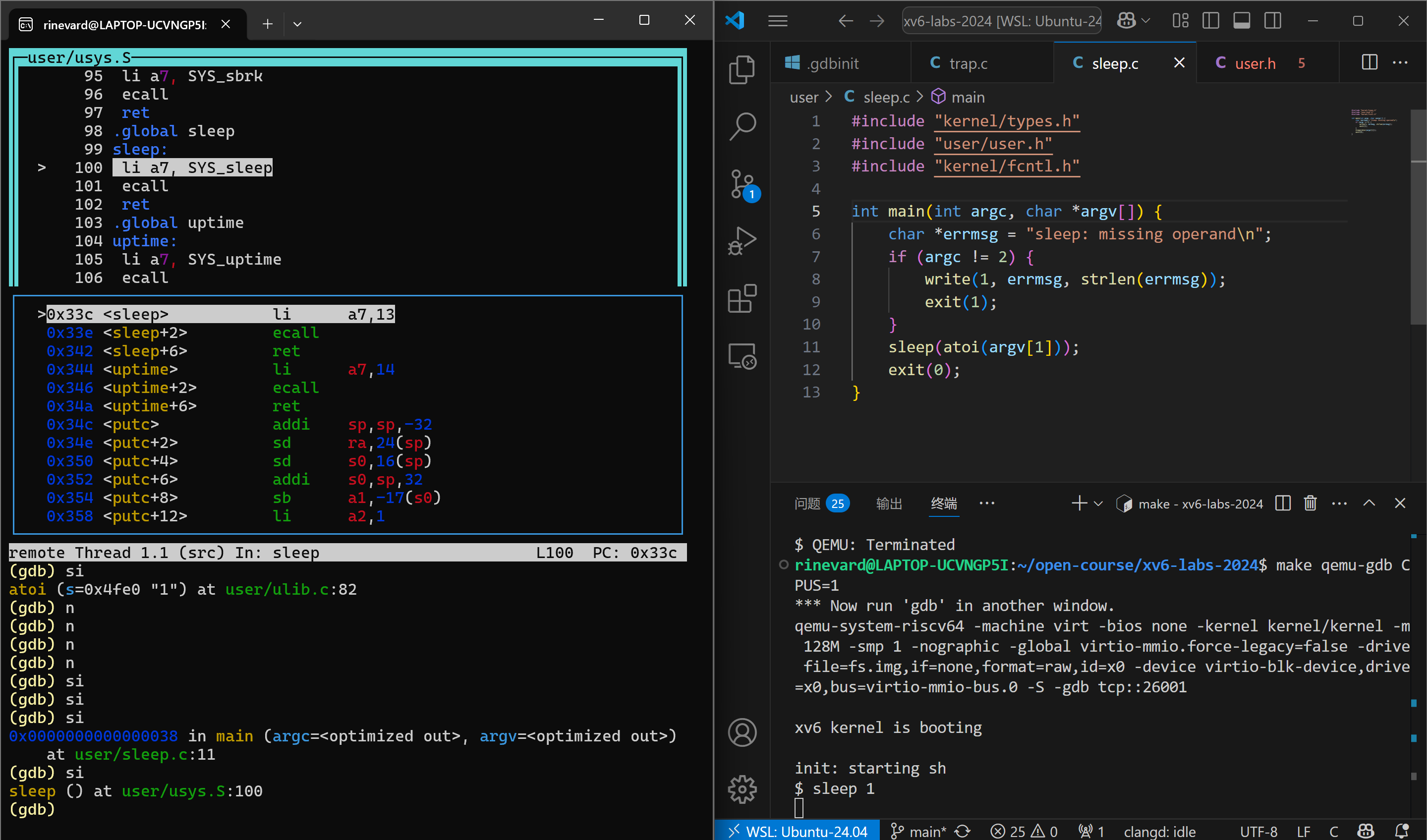 然后在xv6的shell里执行 sleep 1 ,它会在断点处停下。