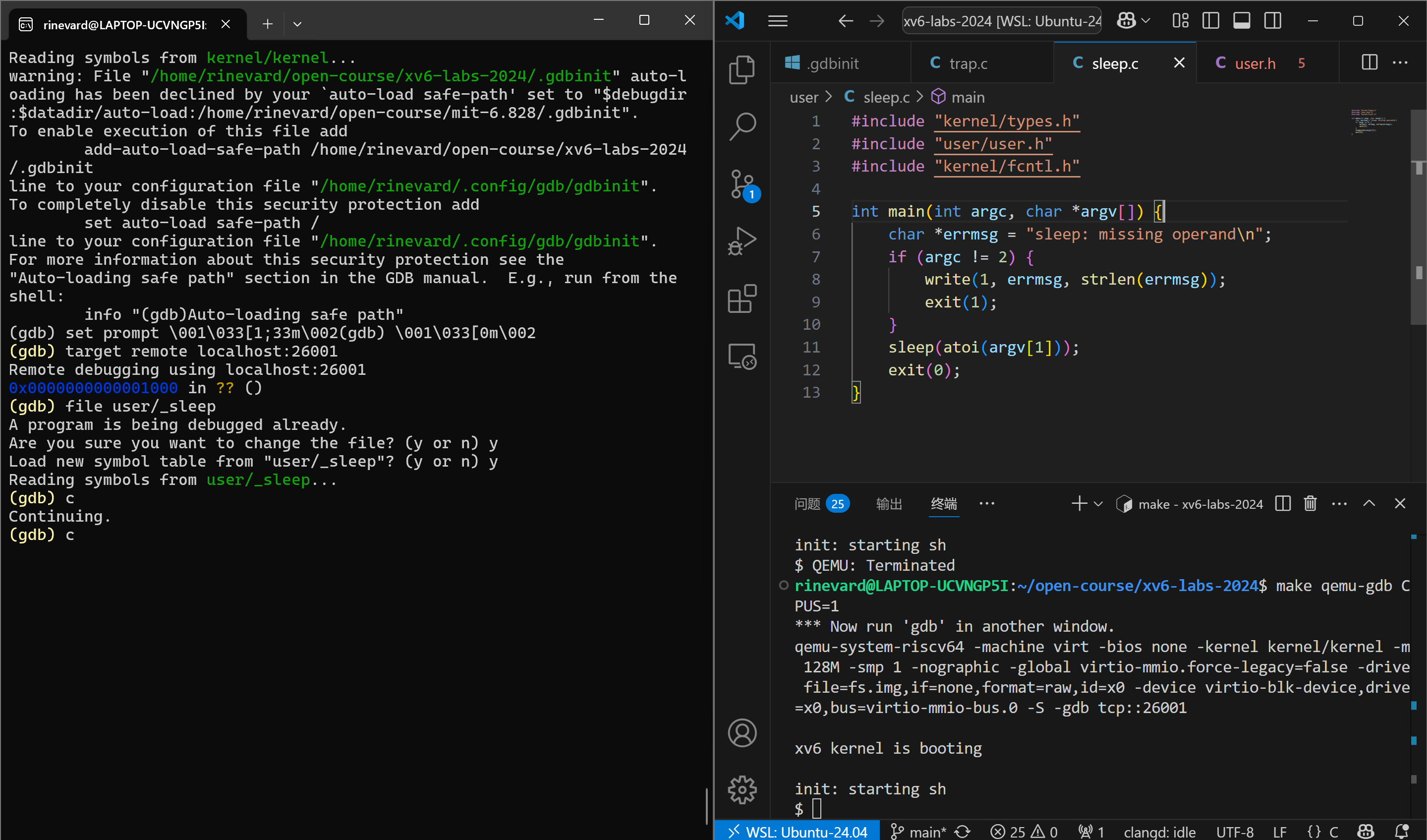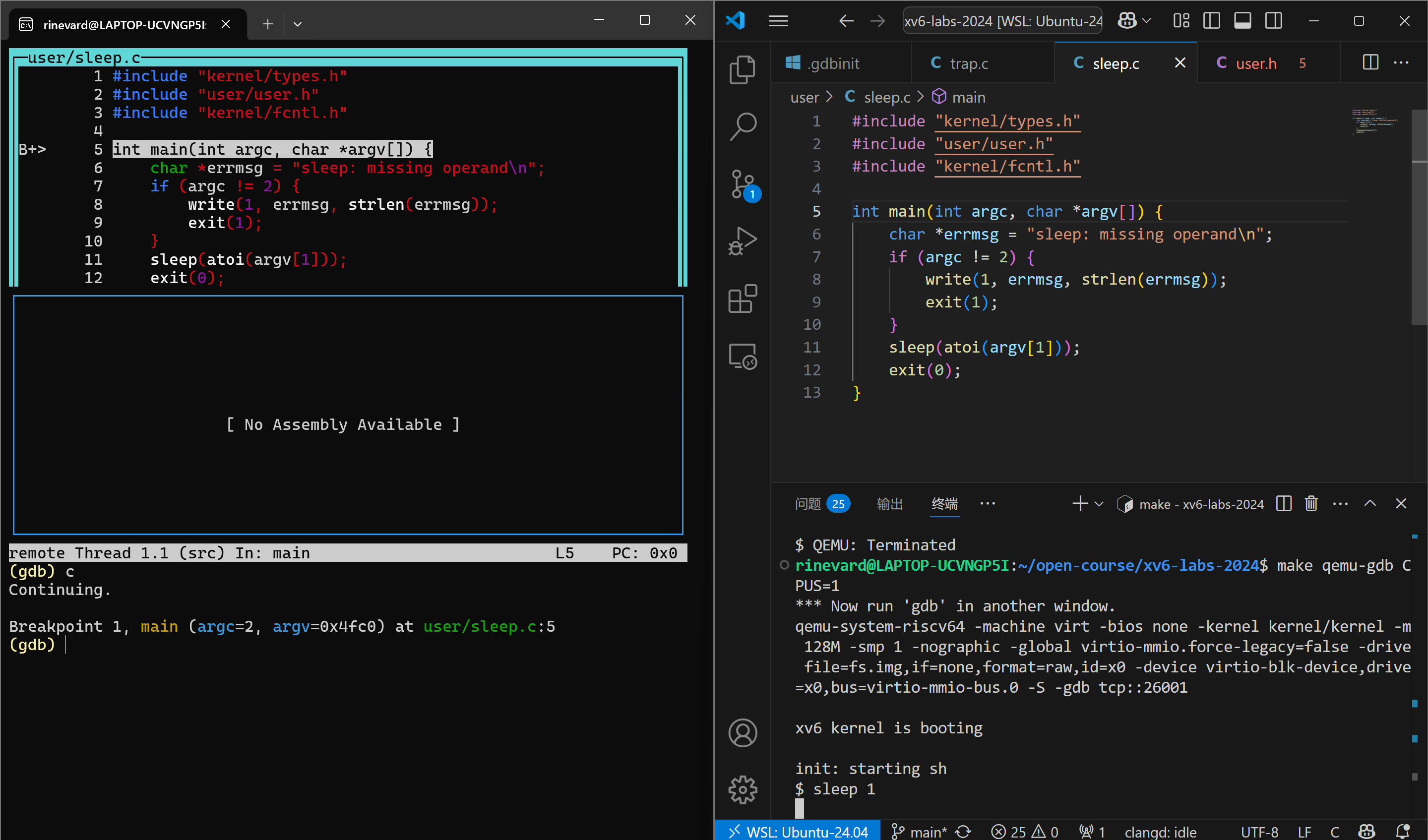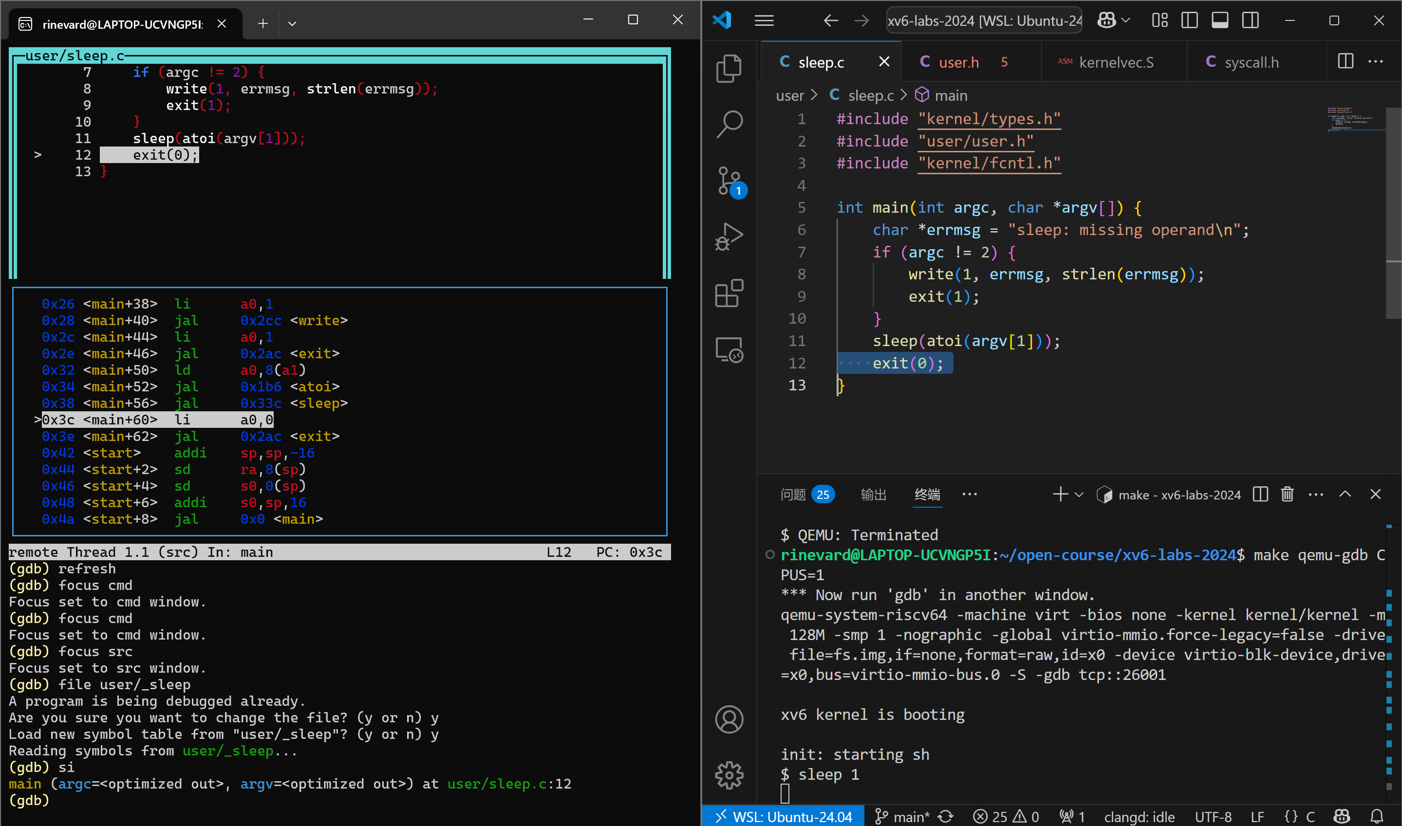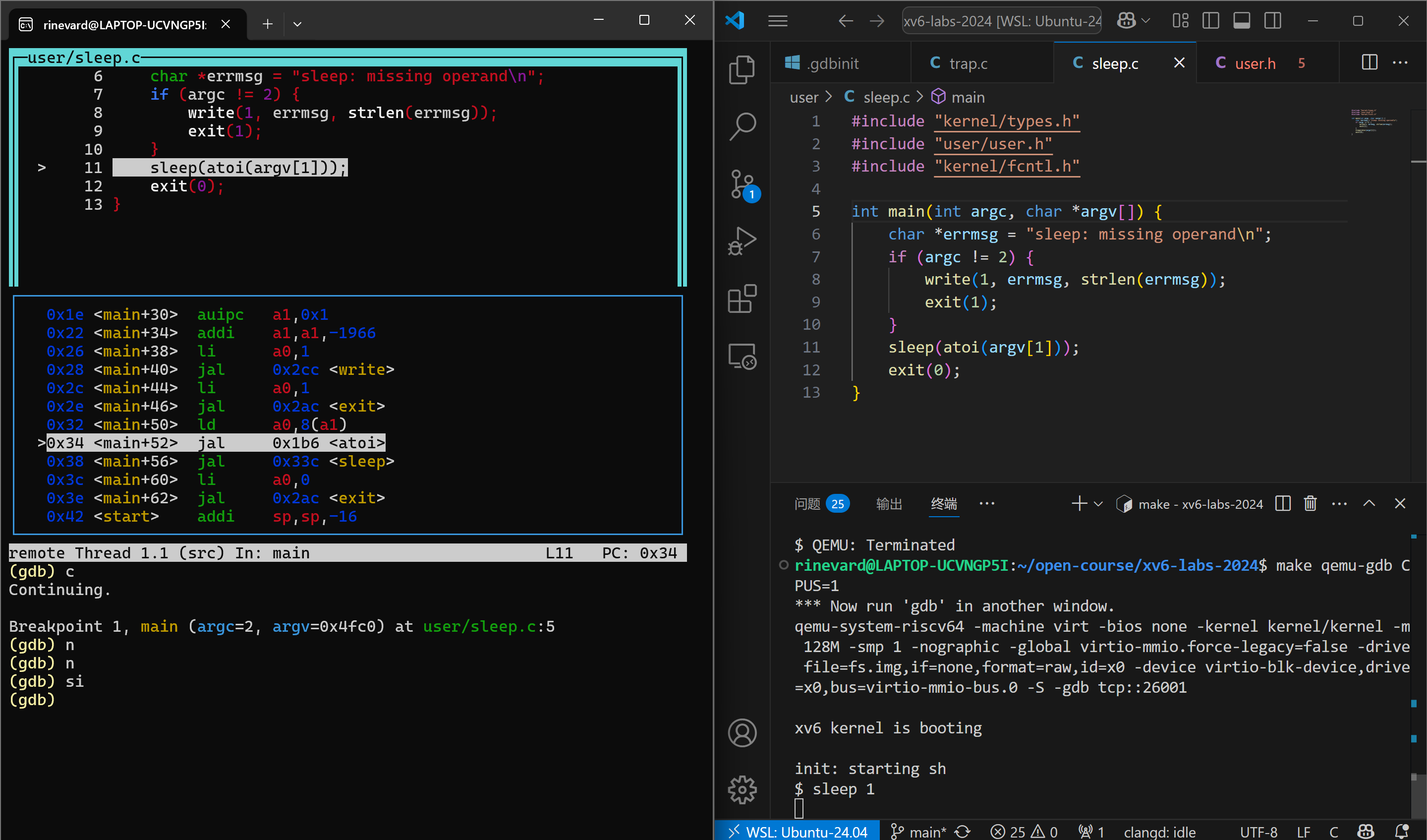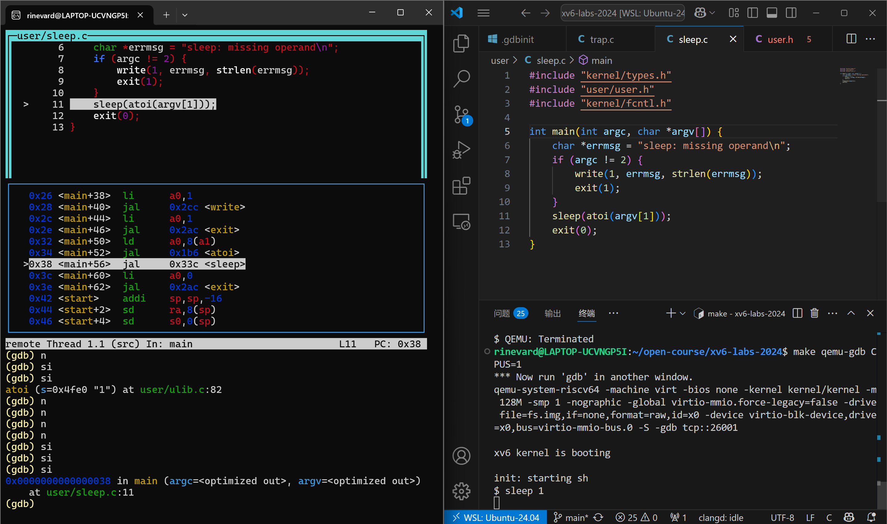 观察左边的gdb,可以看到它停在了sleep.c的main函数。