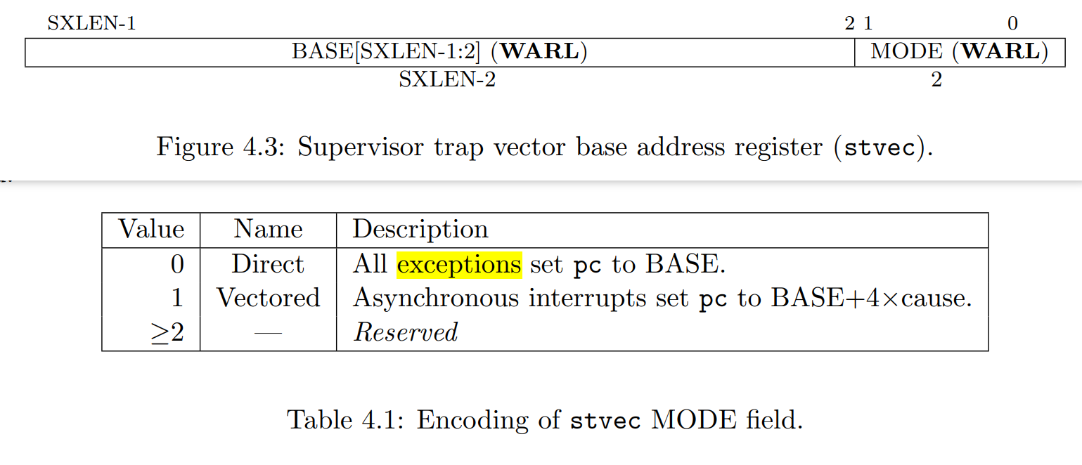 BASE是4字节对齐的(RISC-V 手册 P80),所以在MODE == 0时,我们跳转到的地址是 (stvec >> 2) << 2,而由于 MODE == 0,这个值就是 stvec ;在MODE == 1时,我们转到的地址是 (stvec >> 2) << 2 + 4*cause