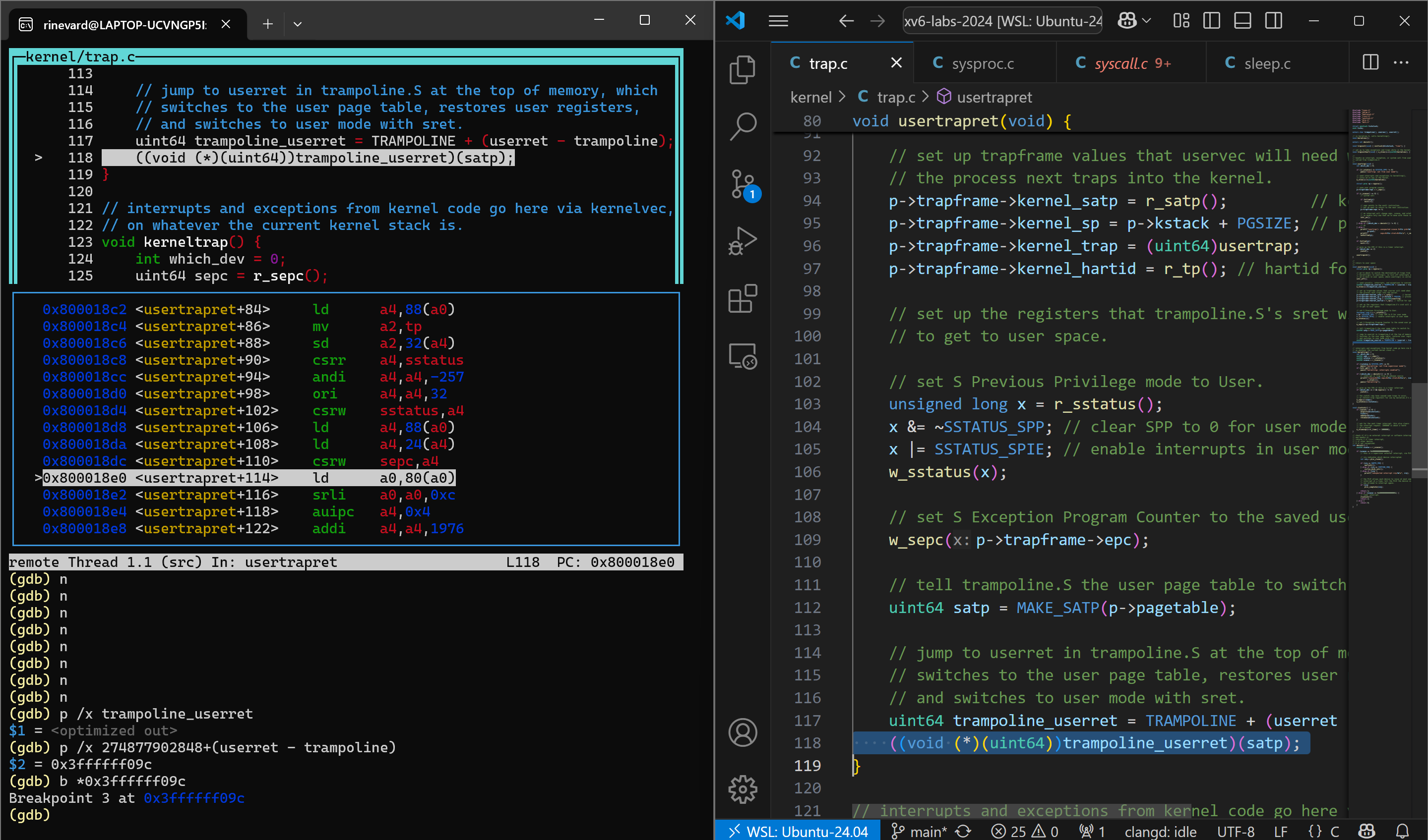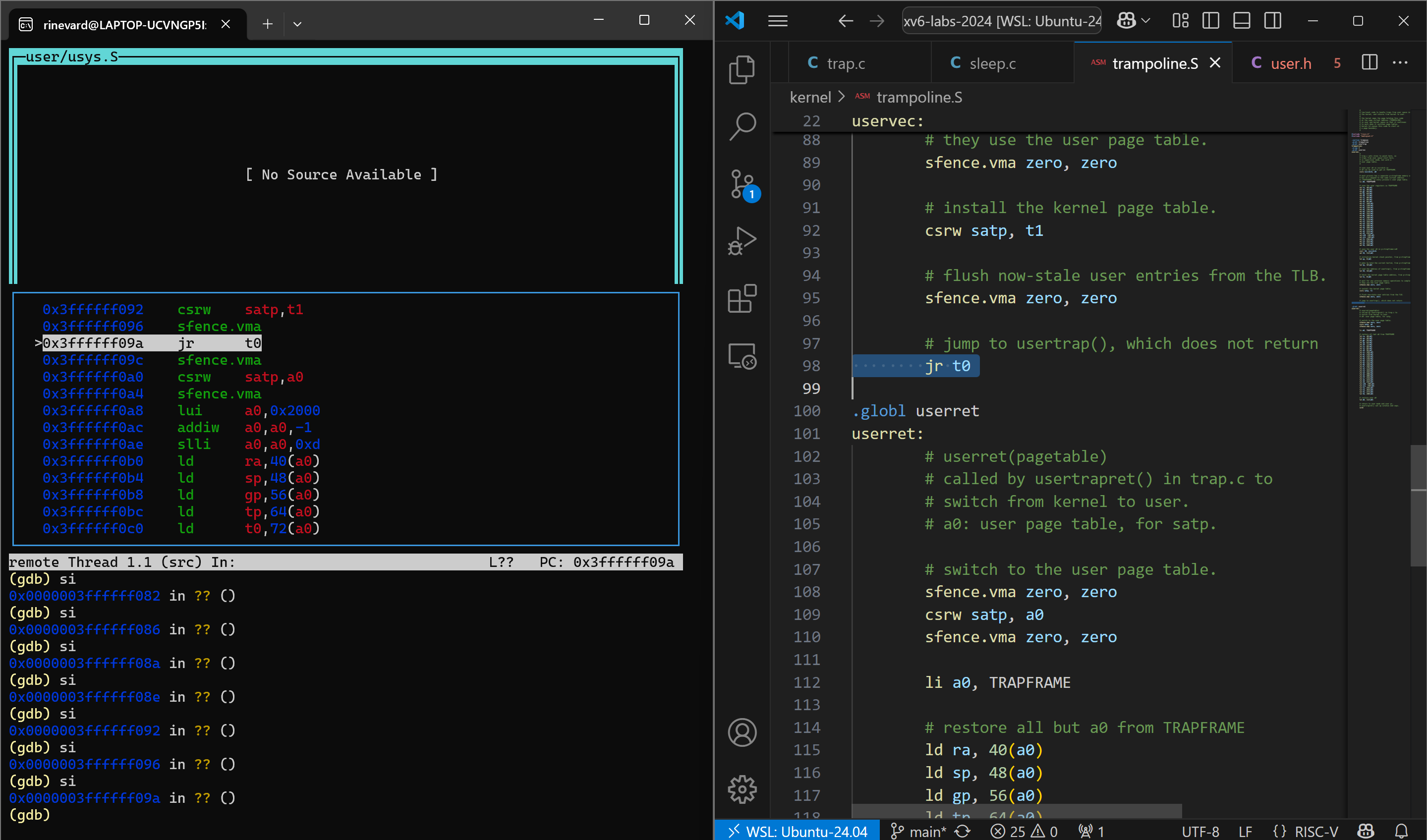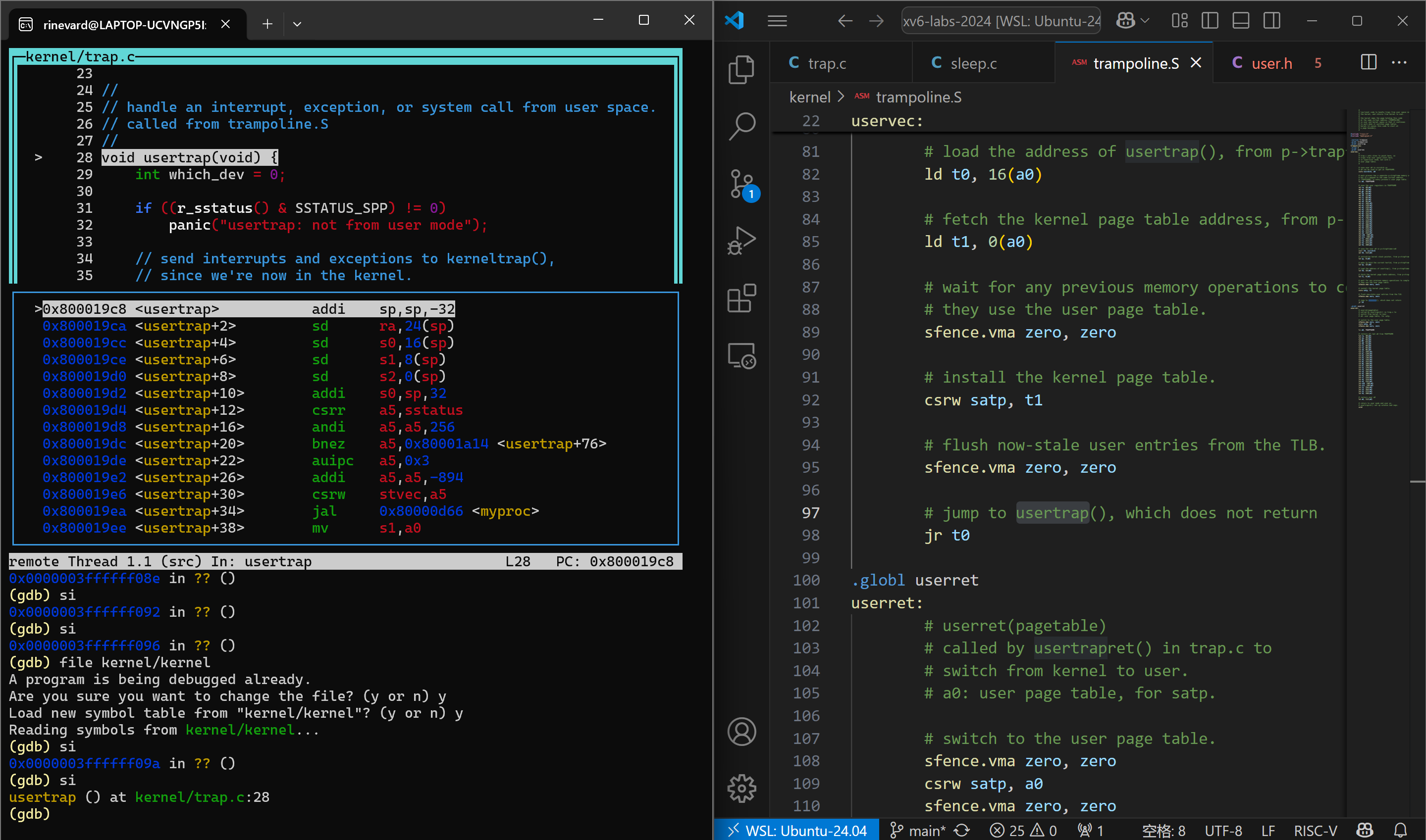 总之一切顺利!让我们暂停一下,想想这个 0x3ffffff000 的地址代表什么。在内核启动时通过file kernel/kernel 加载内核符号表并在usertrapret设置断点,我们可以发现 0x3ffffff000 这个地址和 kernel/trap.c 里的trampoline_uservec 相等。