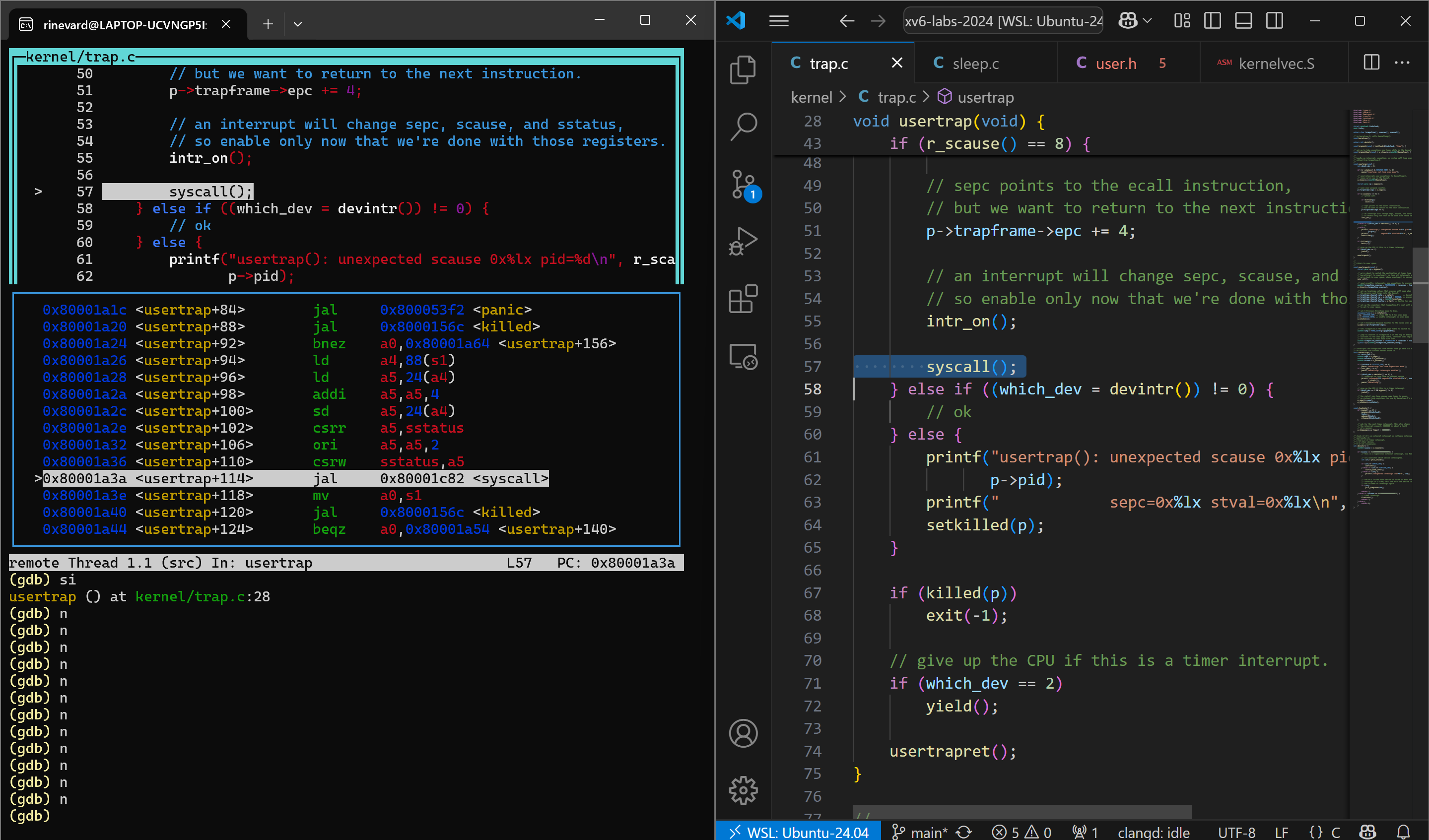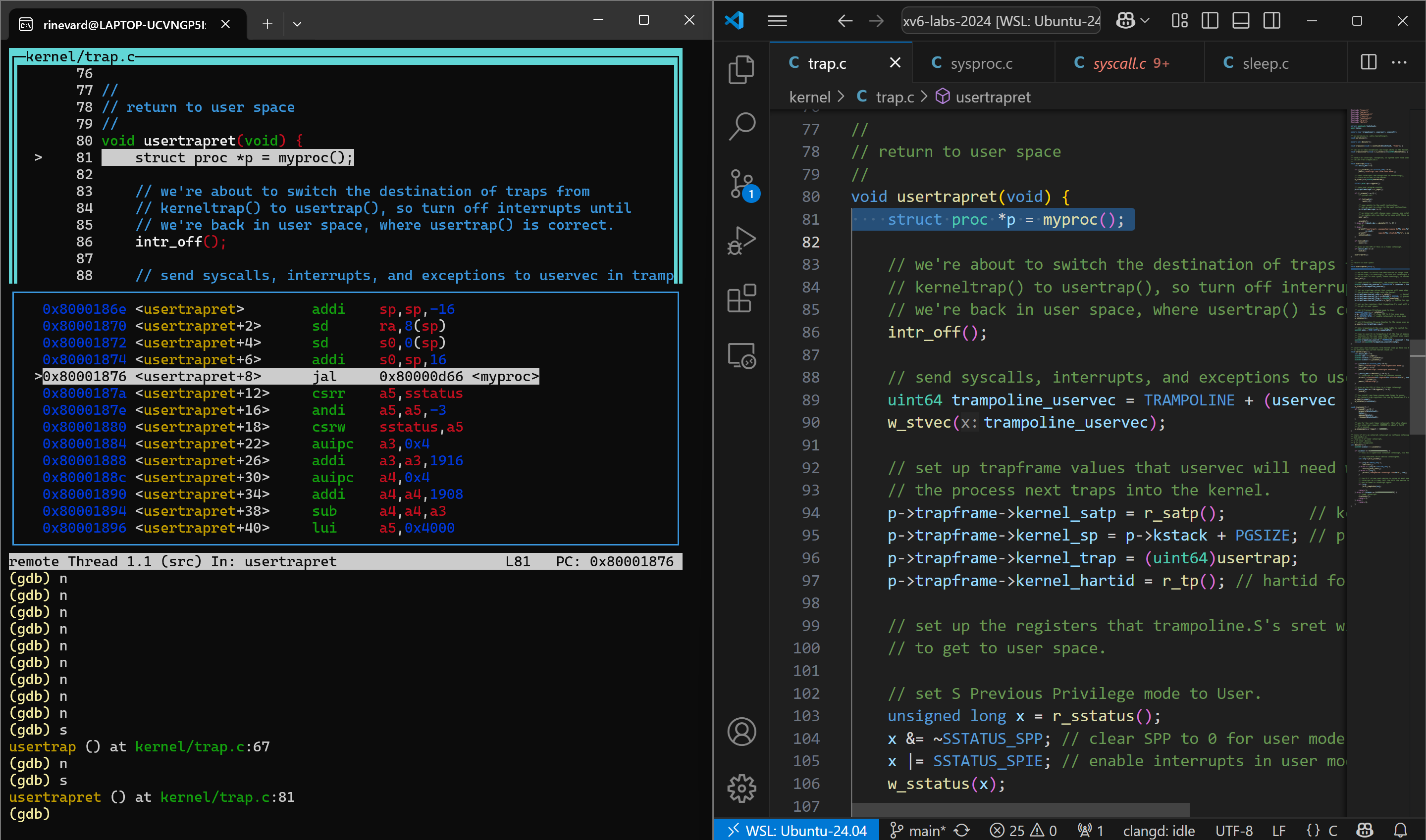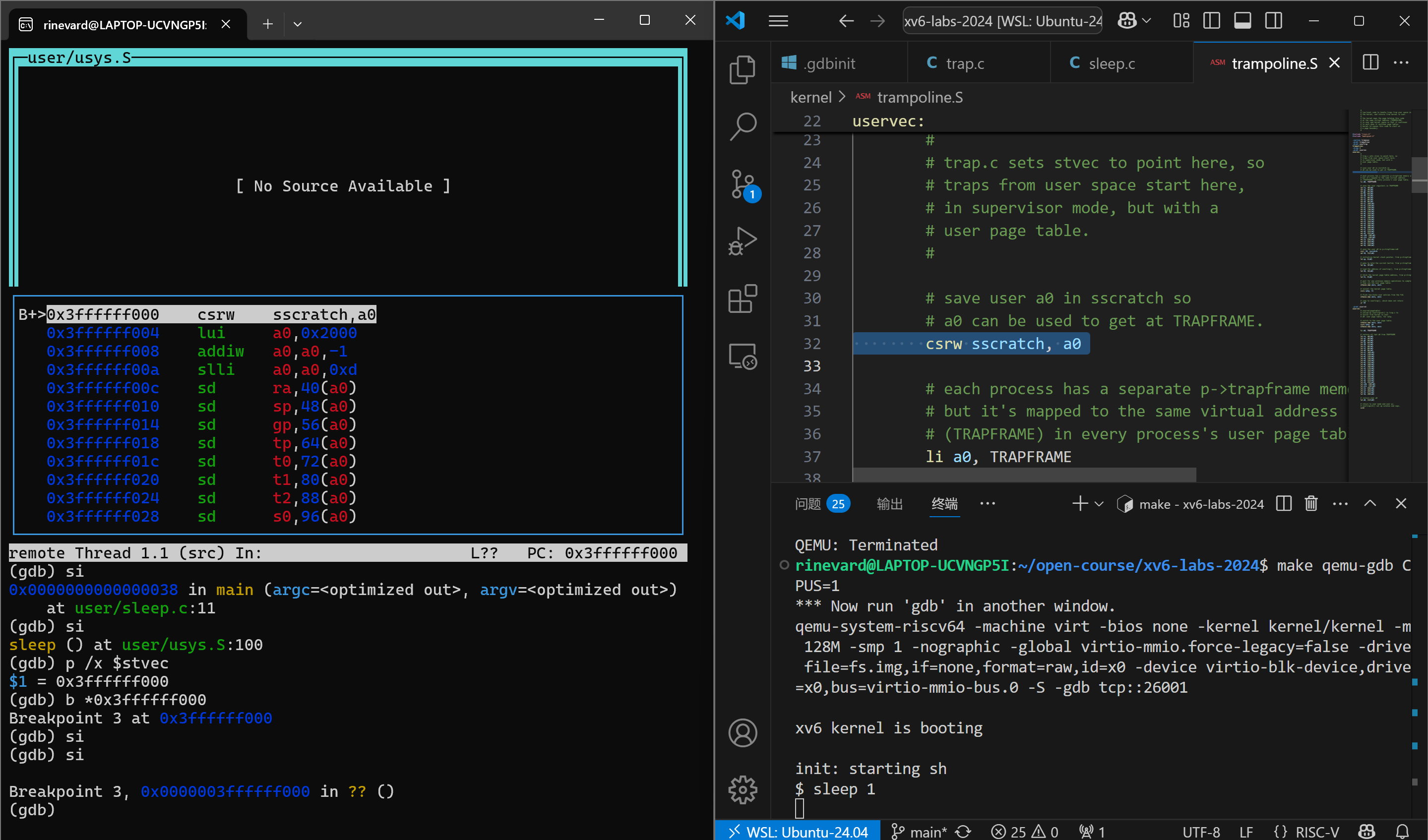 总之一切顺利!让我们暂停一下,想想这个 0x3ffffff000 的地址代表什么。在内核启动时通过file kernel/kernel 加载内核符号表并在usertrapret设置断点,我们可以发现 0x3ffffff000 这个地址和 kernel/trap.c 里的trampoline_uservec 相等。
