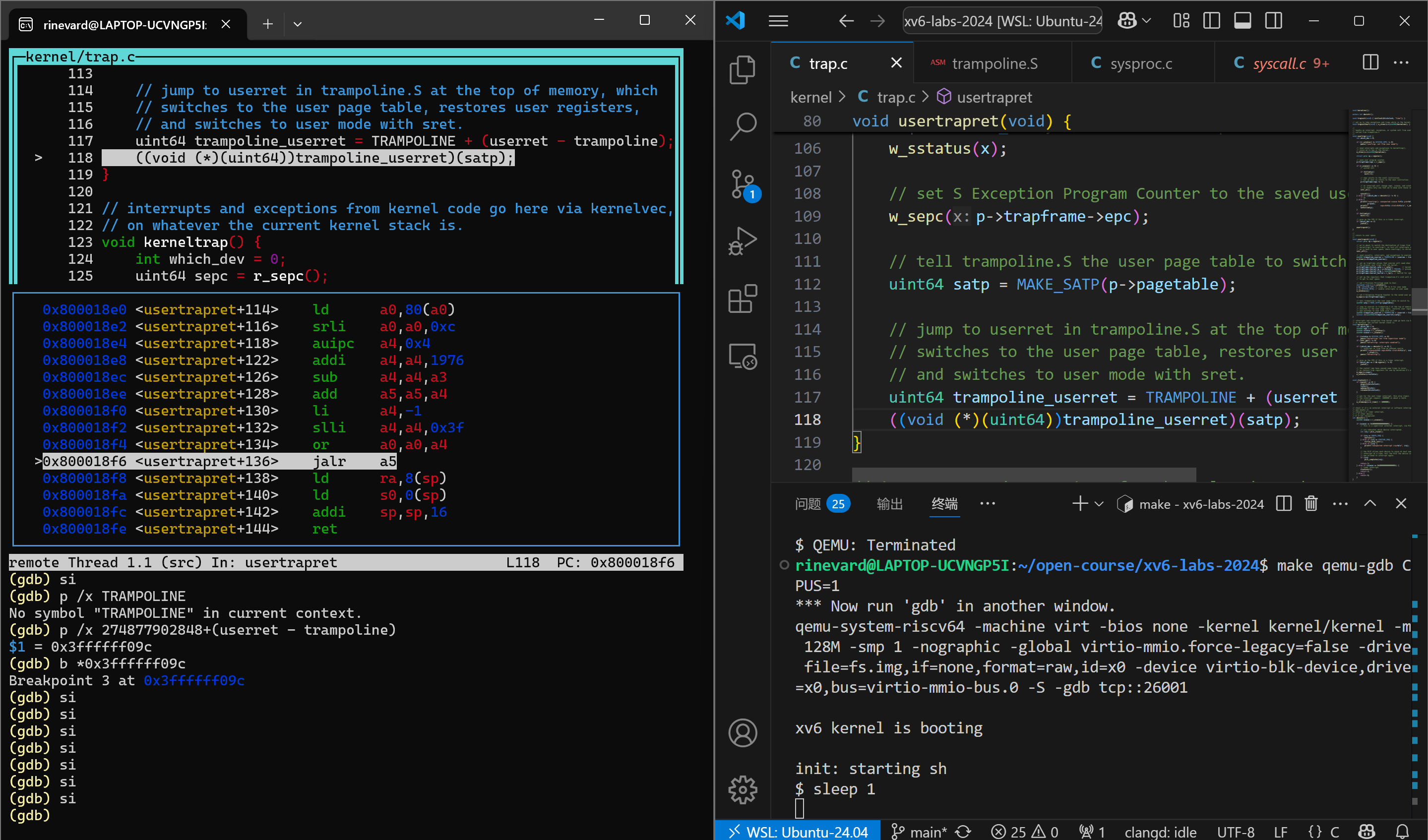 观察左边的gdb,p /x trampoline_userret 没有打印值是因为trampoline_userret被编译器优化掉了,我们要手动把它的表达式写出来再打印,总之我们打印出了 0x3ffffff09c。