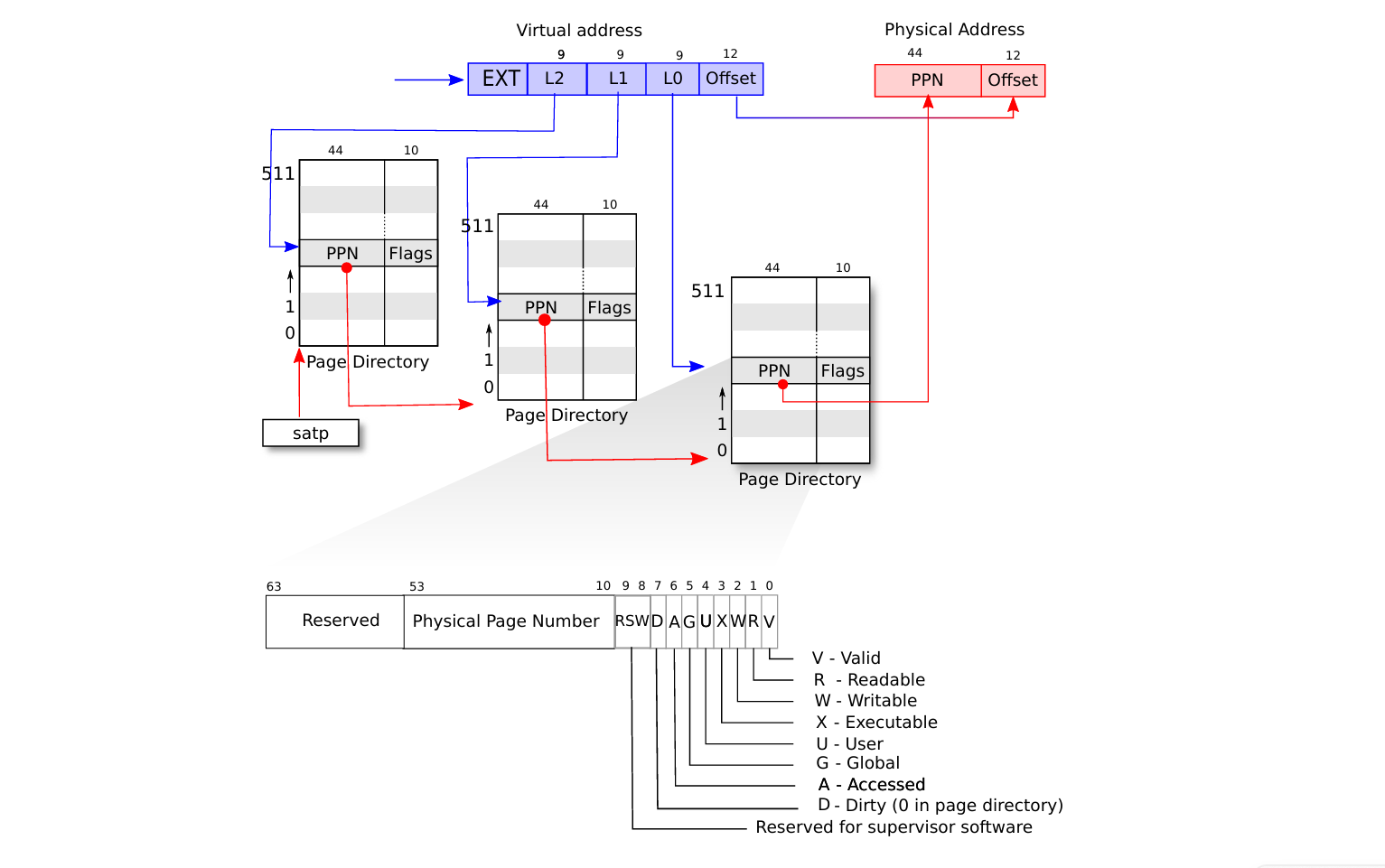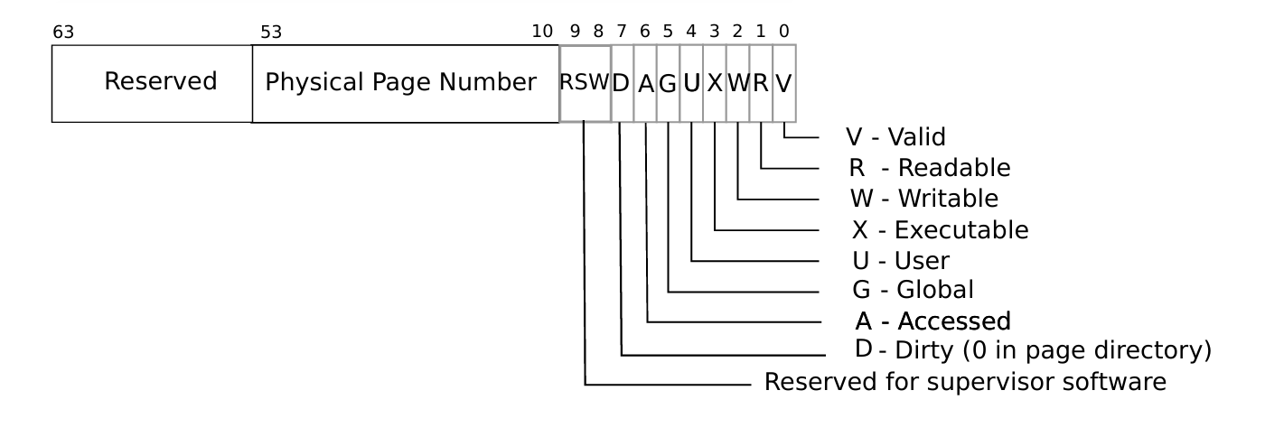 结合 print_pgtbl 的实现,我们可以知道 pgtbltest 遍历了用户进程虚拟地址空间开头和末尾的一些地址,并打印出它们对应的 PTE、物理地址、权限位。让我们先来看看 PTE 的结构: