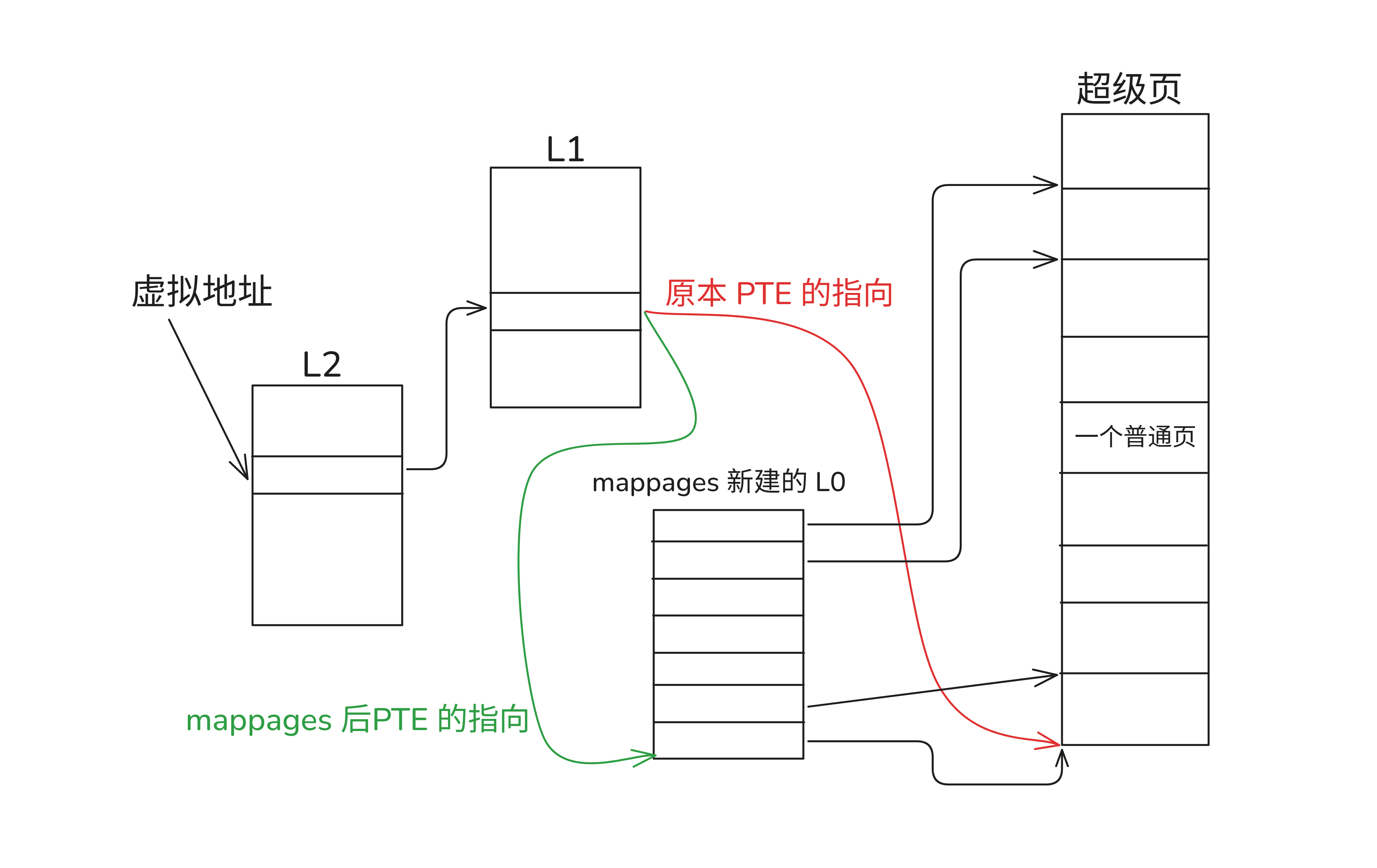 这里主要是上面步骤中的 2b 的“退化”比较棘手,我是把页表里对应超级页的 L1 leaf 设置成了 invalid,然后把超级页视作多个普通页的合并,从超级页的开头出发做若干次 mappages 从而完成退化。思路可以参考下图: