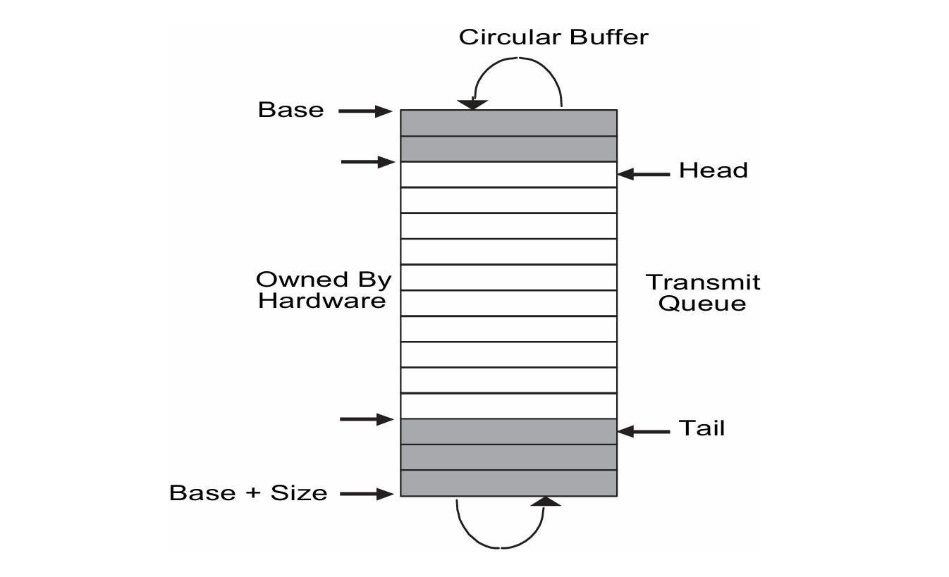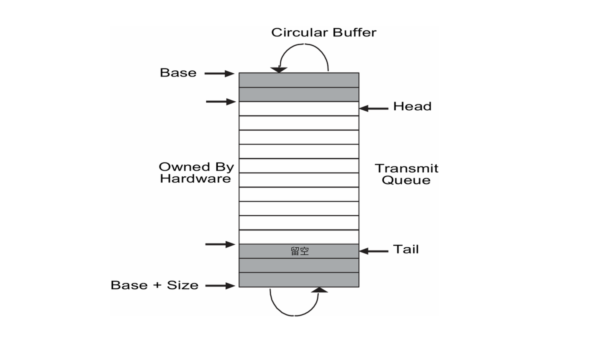 下图是 rx_ring 的示意图,TAIL 指向硬件能够处理的最后一个描述符之后的位置,这也是软件写入第一个新描述符的位置。与 rx_ring 不同,tx_ring 无留空。