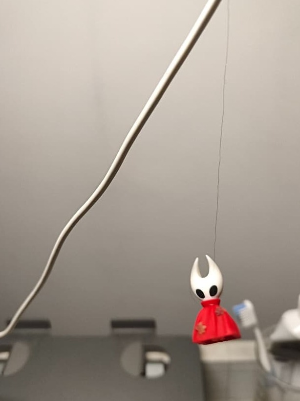 开玩笑的,这超出射程范围了。不过我翻出了一根废弃数据线,用小刀把它割开就能拿出里面的细铜线了。这个东西太细而且弯弯绕绕以至于想打结都挺难的,但经过不懈努力我还是把它绑在了大黄蜂身上。我们先把它挂到灯线上打个结试试效果吧!