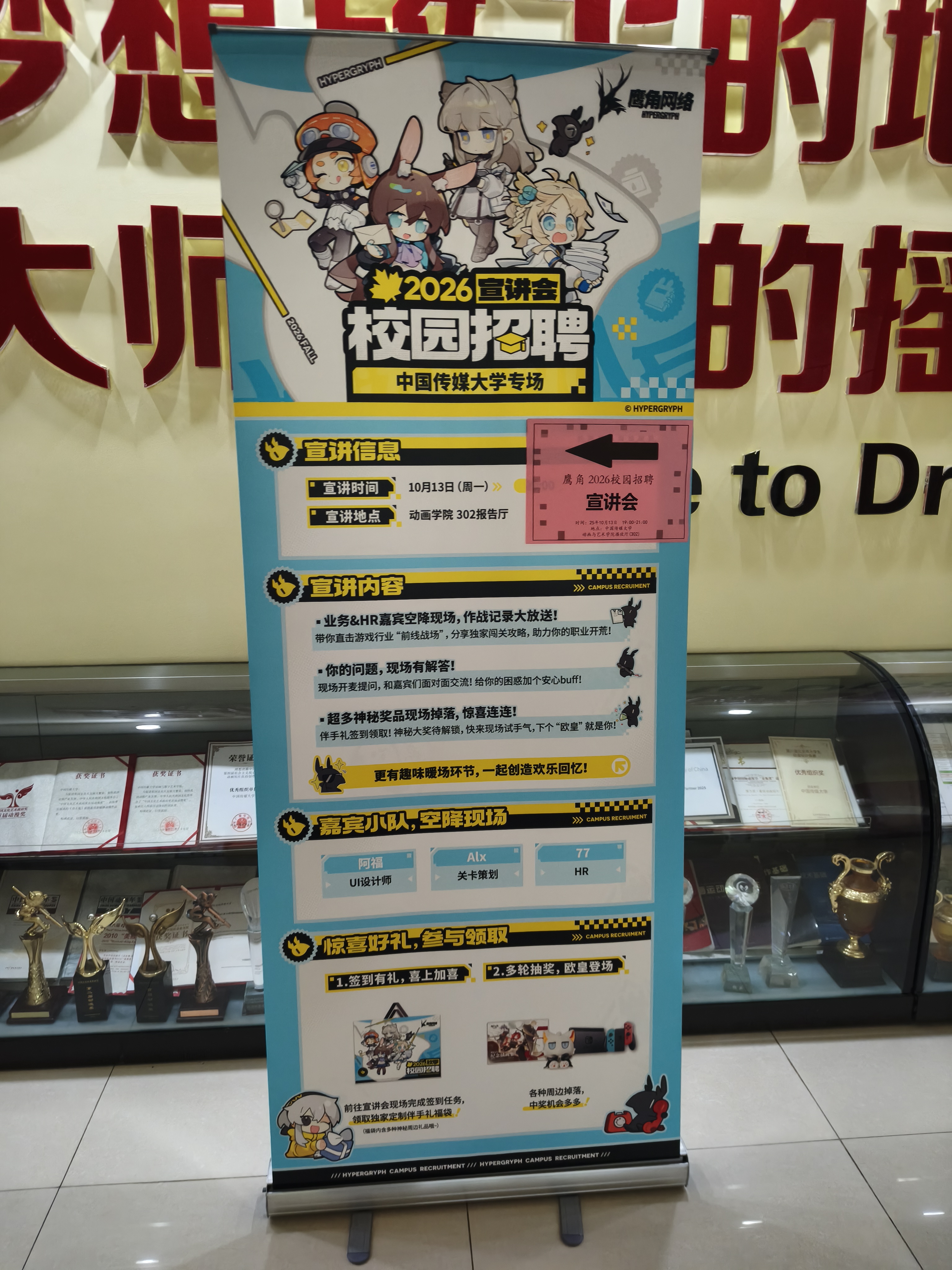 今天鹰角在中传开了个宣讲会,咱作为资深粥粥人当然想去听听看。访客进中传需要找校内同学或老师预约,于是咱就找了这位美术同学然后成功进入中传了。