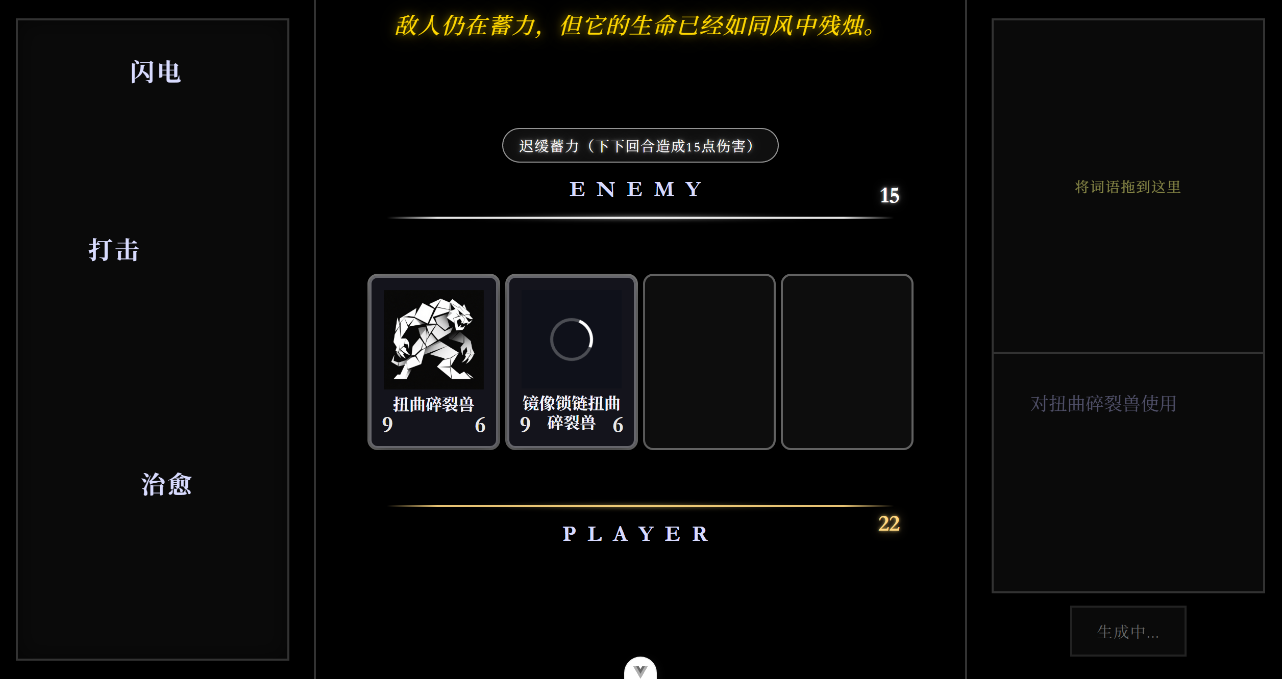 在得到了“把整个游戏状态都交给 LLM 管理”这个概念后,我脑海中就呈现出了这个游戏现在的样子——让玩家组合词汇来创造魔法,LLM 解析魔法并改变场面。不过我感觉自己以前的设计都是除了概念一无是处的设计,所以这次想试试之前看到的“注重外围设计”的做法。